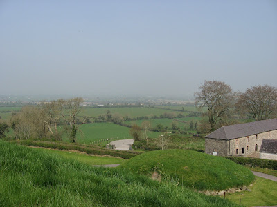 On our way back down the hill, we saw several old churches in the valley near the farm that combine christian and Celtic heritage, and a rock pile built by the British for mapping and navigating. Here is a picture of a recently born calf and it's mom in the green fields of the valley: