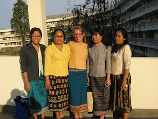 The beautiful ladies of IM - Residents Payvanh, Khamvay, Libby, Velouvanh (Fellow at KKU) and Phouthasone. Phouthasone was unhappy about being in the sun. Notice my beautiful woven silk Sam-Neua style sin; This is what gets the compliments, not actually me.:)