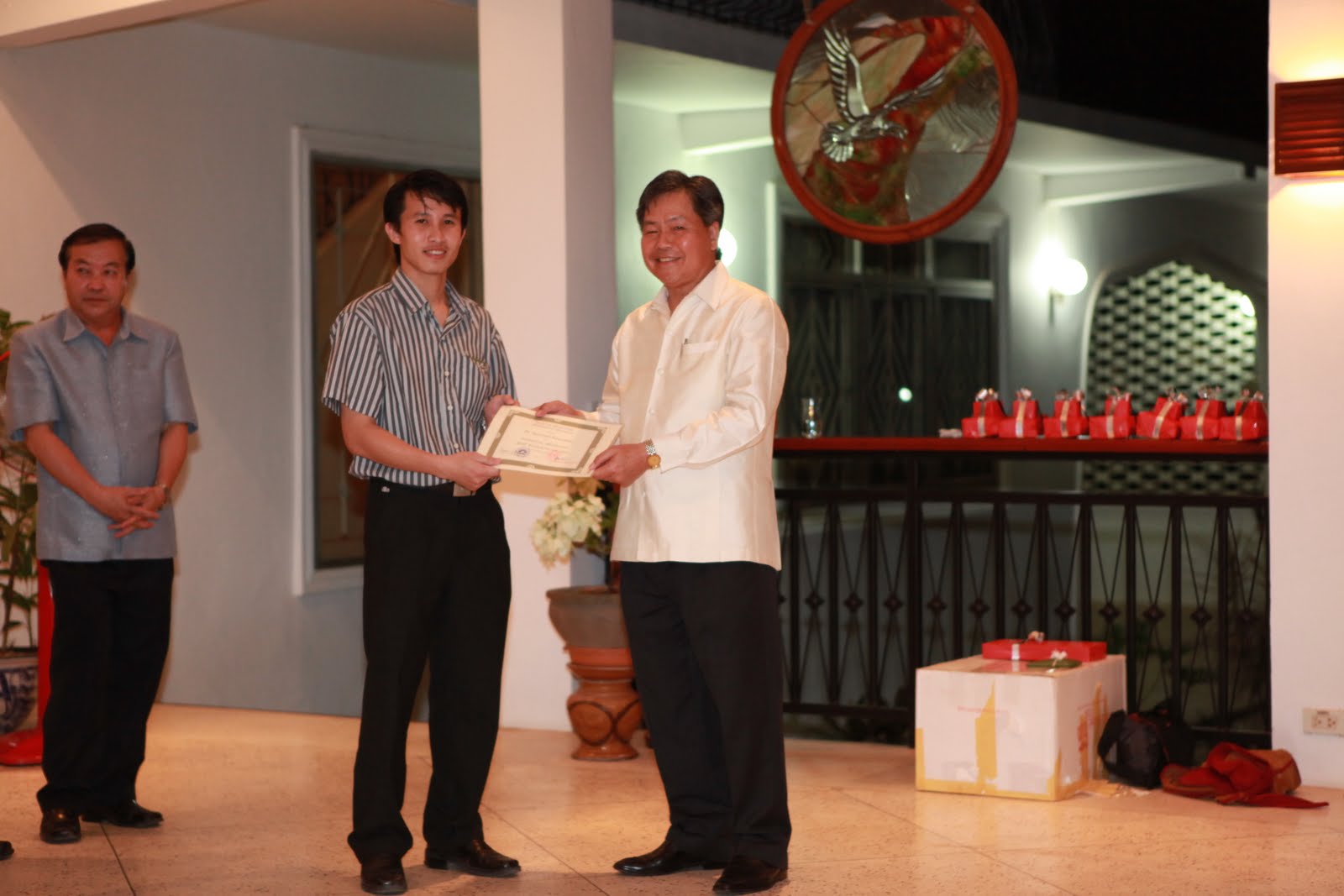 Phanivone and Phonpadith present Dr. Bouachanh with his award.