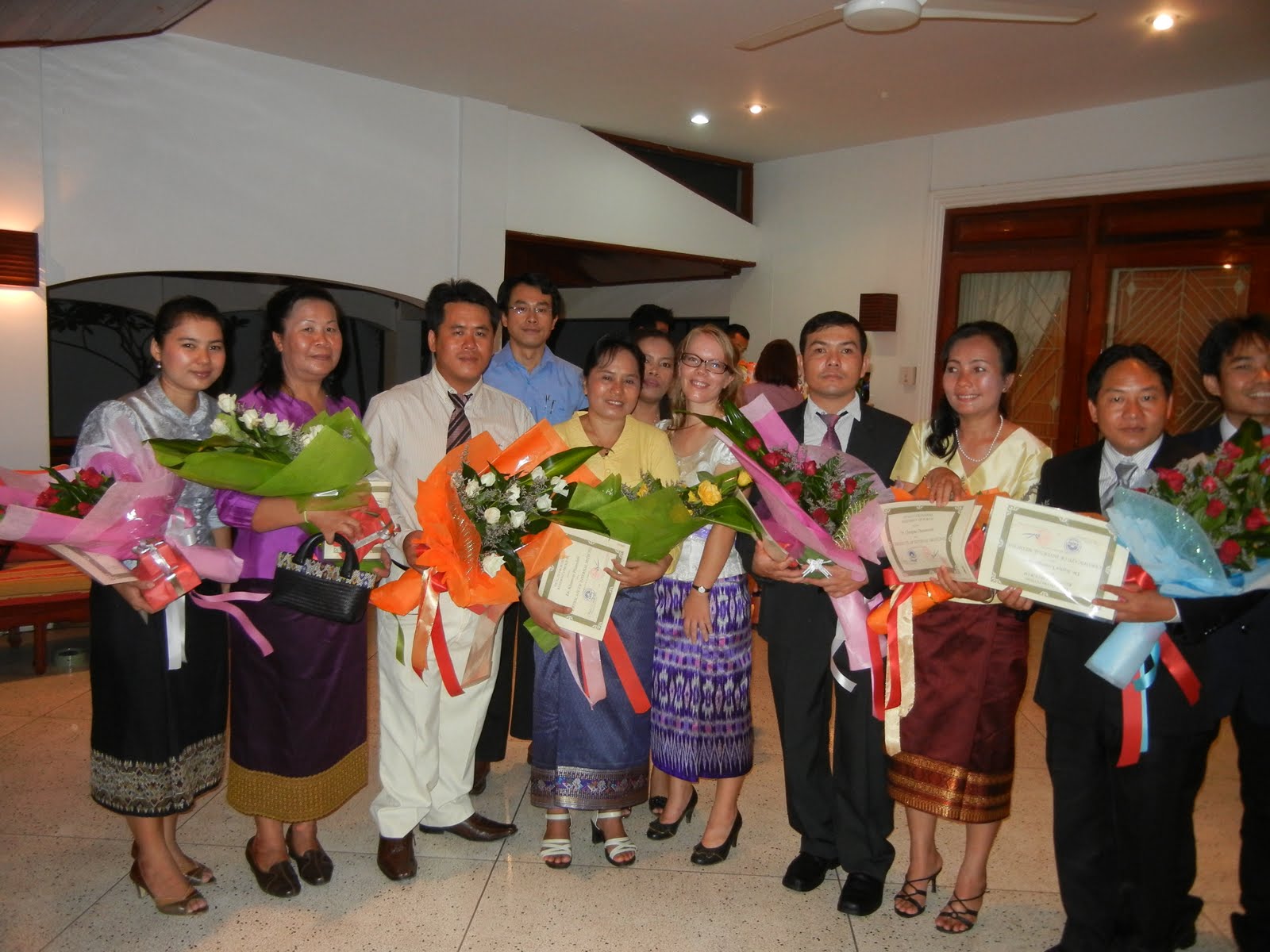 Finally, in the end of the formal ceremony, we announced the IM graduates. They got a certificate, flowers, and a glucometer as a parting gift. In years past we’ve given them text books, but I think the glucometer is a practical gift that will get used - even by the residents who don’t read English well enough to really make use of a text - so I’m pleased with it. Last year, the presents didn’t get here until after the ceremony, and we ended up giving them at the University ceremony for peds and at CME for IM, so it was also nice to have them to give on the actual night of the ceremony. This is what I said: “We would like to honor and congratulate the Internal medicine graduates of 2010. I have only known them for 9 short months, but I feel confident that each and every one of these doctors will go on to be a teacher and leader in the hospitals in which they practice. Four of them will be returning to provincial or district hospitals this year, and three of them will be the first specialty-trained internists in the hospital when they arrive.” Dr. Bounkong, Dr. Vang Chu, and Dr. Bouachanh presented the certificates and presents to the residents as I read their names, so they were literally each surrounded by their incredible, supportive teachers who are great role models for them as the enter independent practice again.