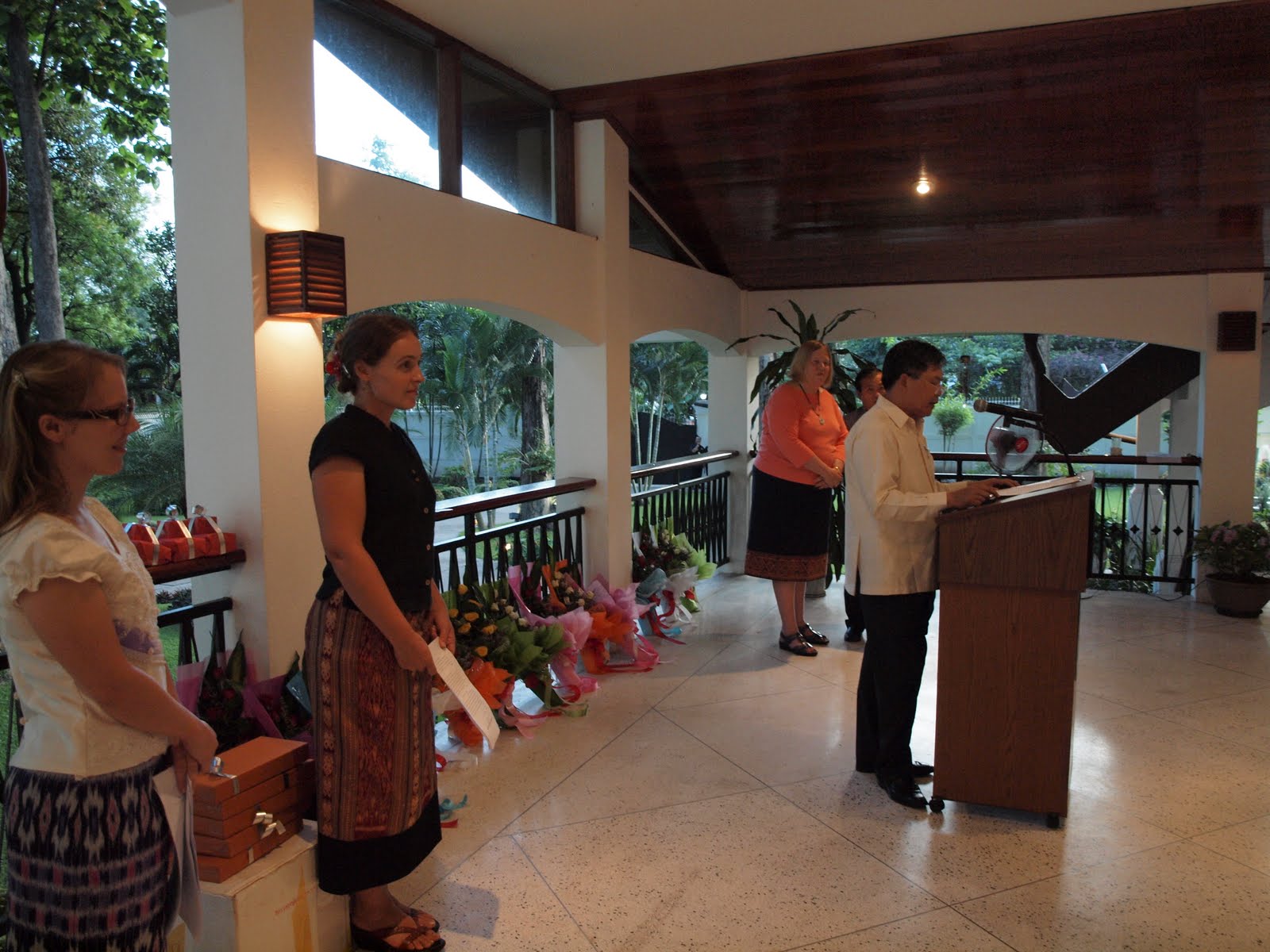 The formal part of the night was relatively short - just over an hour. I welcomed everyone and introduced the Ambassador, who gave a short speech in Lao and English. The current Ambassador, Her Excellency Karen Stewart, was the Charge D’Affairs (interim head of the embassy) when the tradition of having graduation at the Ambassador’s residence was started 10 years ago, and this is her first year back as Ambassador, so that was nice. I was impressed that she spoke in both Lao and English. The Lao people were impressed by how tall she is for a woman - she is quite tall, and towered over (in a very friendly, welcoming way) all the Lao guests. I bet she gets really, really tired of comments about her height.