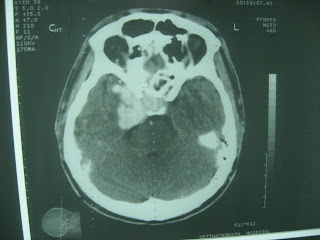 Just before new years, the residents asked me to see a patient who had been admitted to the hospital for hiccoughs. When I saw him, the story was a bit more complicated, and included a motor vehicle accident with head trauma 10 years ago, and had been told that he had a hematoma but then had no follow up. He had a left sided daily headache for 2-3 years, pain around (but not inside) the left ear for several days, bleeding from the left ear for one day, and one day of subjective fever within the week prior to admission. At the end of the encounter, they mentioned that he had Hepatitis B and had been treated with interferon for 15 weeks several years ago. His headache was variable, not always in the morning, and didn’t fit migraine or cluster headache patterns either. It had improved with paracetamol, and his hiccoughs (his original presenting complaint) had been present for a week prior to admission, and had improved but not completely resolved over several days with metoclopramide. (He came on Friday and I saw him on Monday or Tuesday.) I think the residents had already decided to do a head CT, and I encouraged them with that plan, explaining that Hiccoughs can come from the brain/nerves or the diaphragm, and I was hopeful that his were from the diaphragm, but his story was worrisome that they might be from the brain.