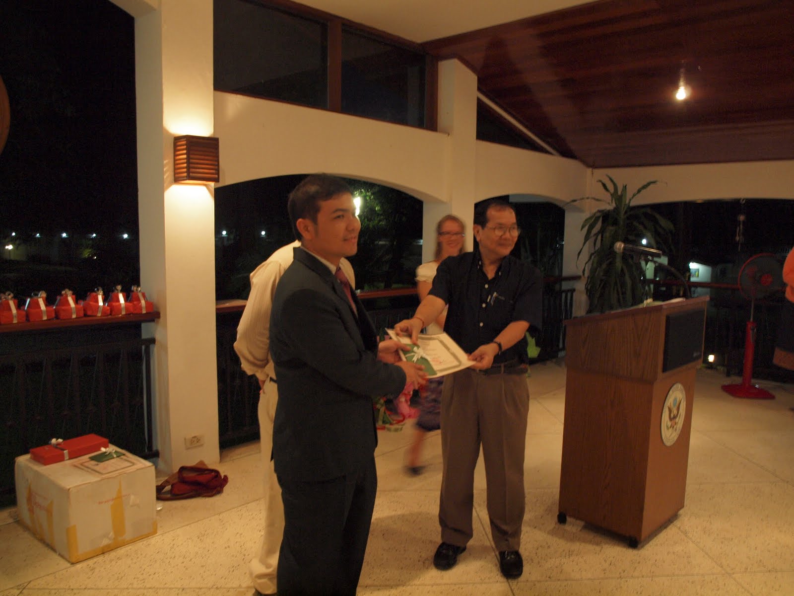 The formal part of the night was relatively short - just over an hour. I welcomed everyone and introduced the Ambassador, who gave a short speech in Lao and English. The current Ambassador, Her Excellency Karen Stewart, was the Charge D’Affairs (interim head of the embassy) when the tradition of having graduation at the Ambassador’s residence was started 10 years ago, and this is her first year back as Ambassador, so that was nice. I was impressed that she spoke in both Lao and English. The Lao people were impressed by how tall she is for a woman - she is quite tall, and towered over (in a very friendly, welcoming way) all the Lao guests. I bet she gets really, really tired of comments about her height.